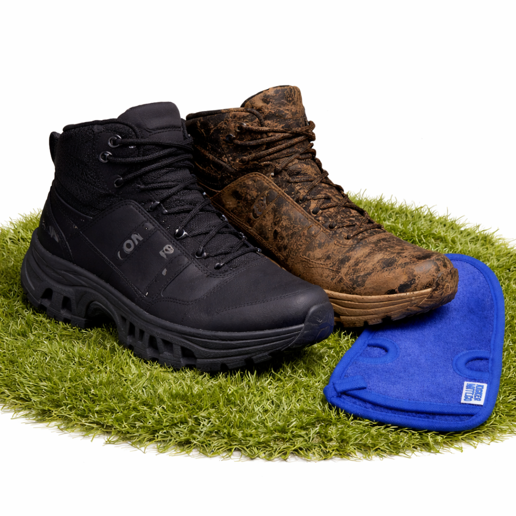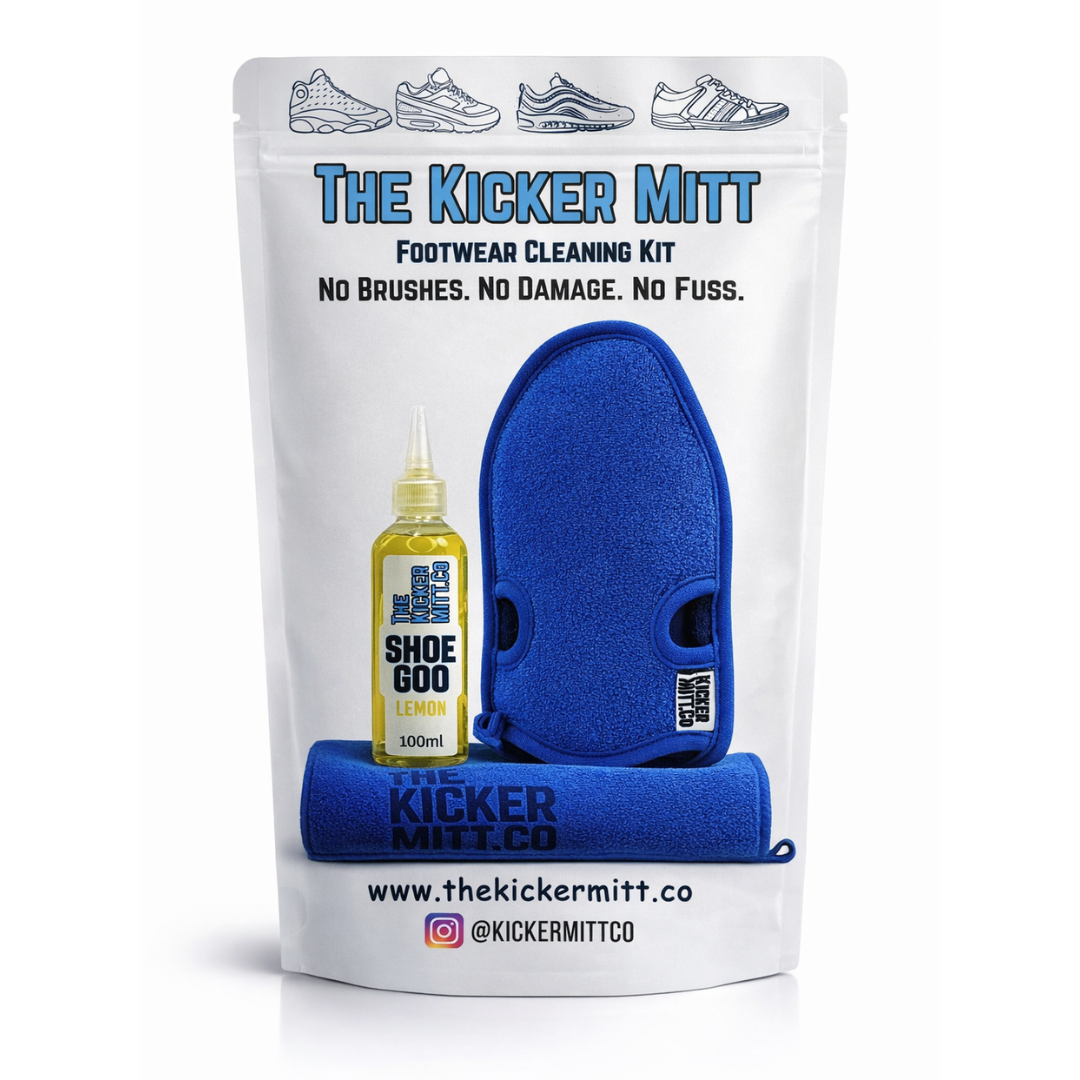 Each kit includes the Kicker Mitt™, Shoe Goo cleaning solution, a branded microfibre towel, and a durable resealable storage bag.