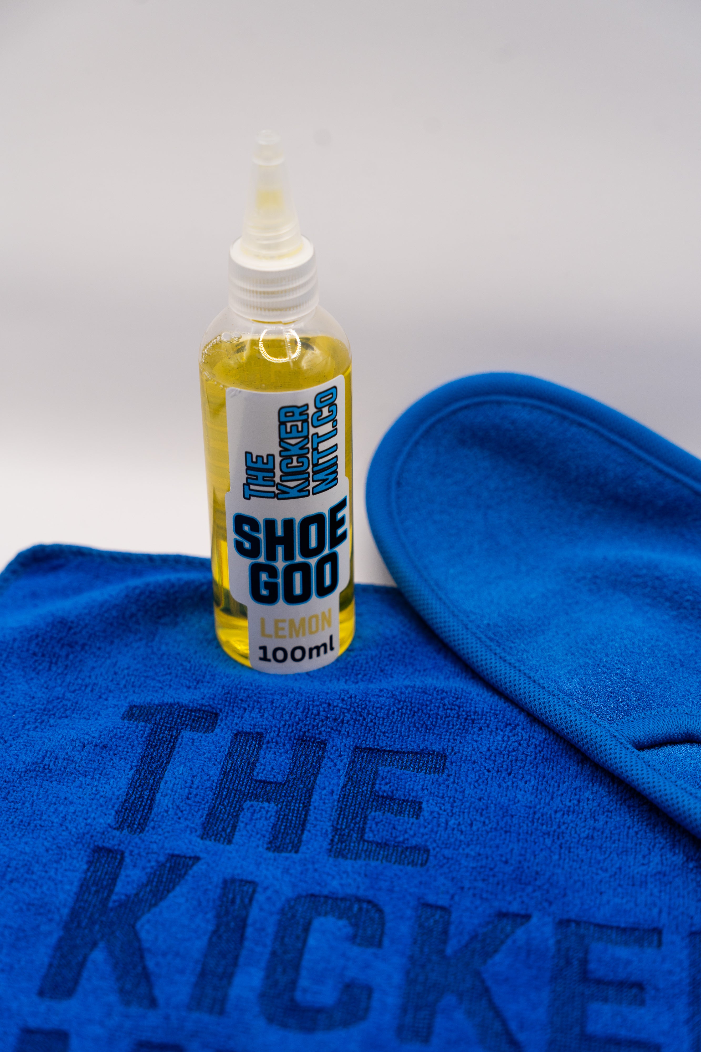Simply add water to the Shoe Goo to create a lather, use the Kicker Mitt to gently scrub the shoe, then wipe or dry using the microfibre towel.